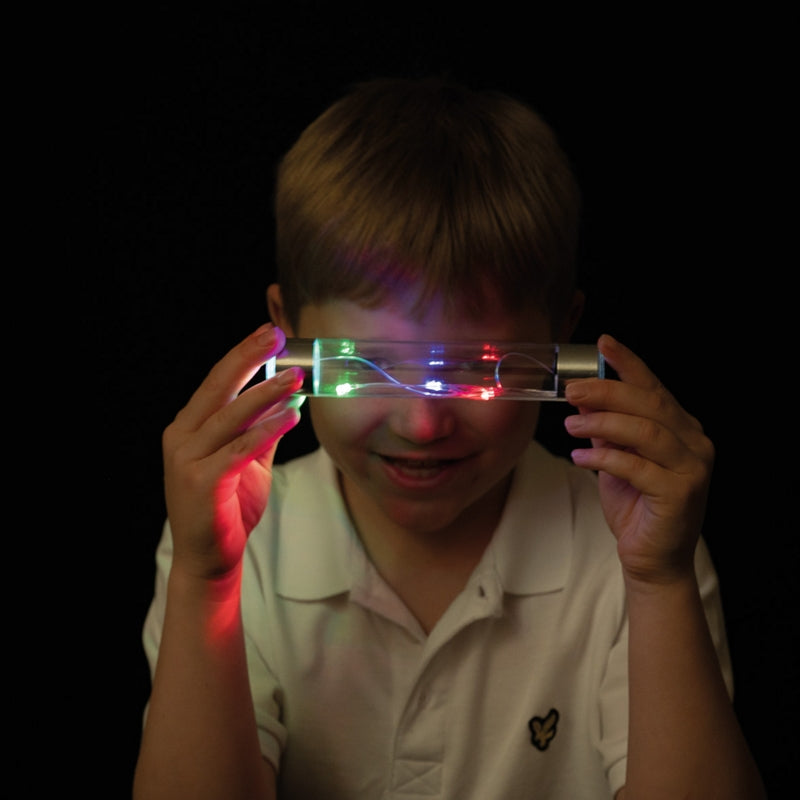 Complete the electrical circuit by touching the foil ends of the stick, resulting in flashing lights and buzzing noises.